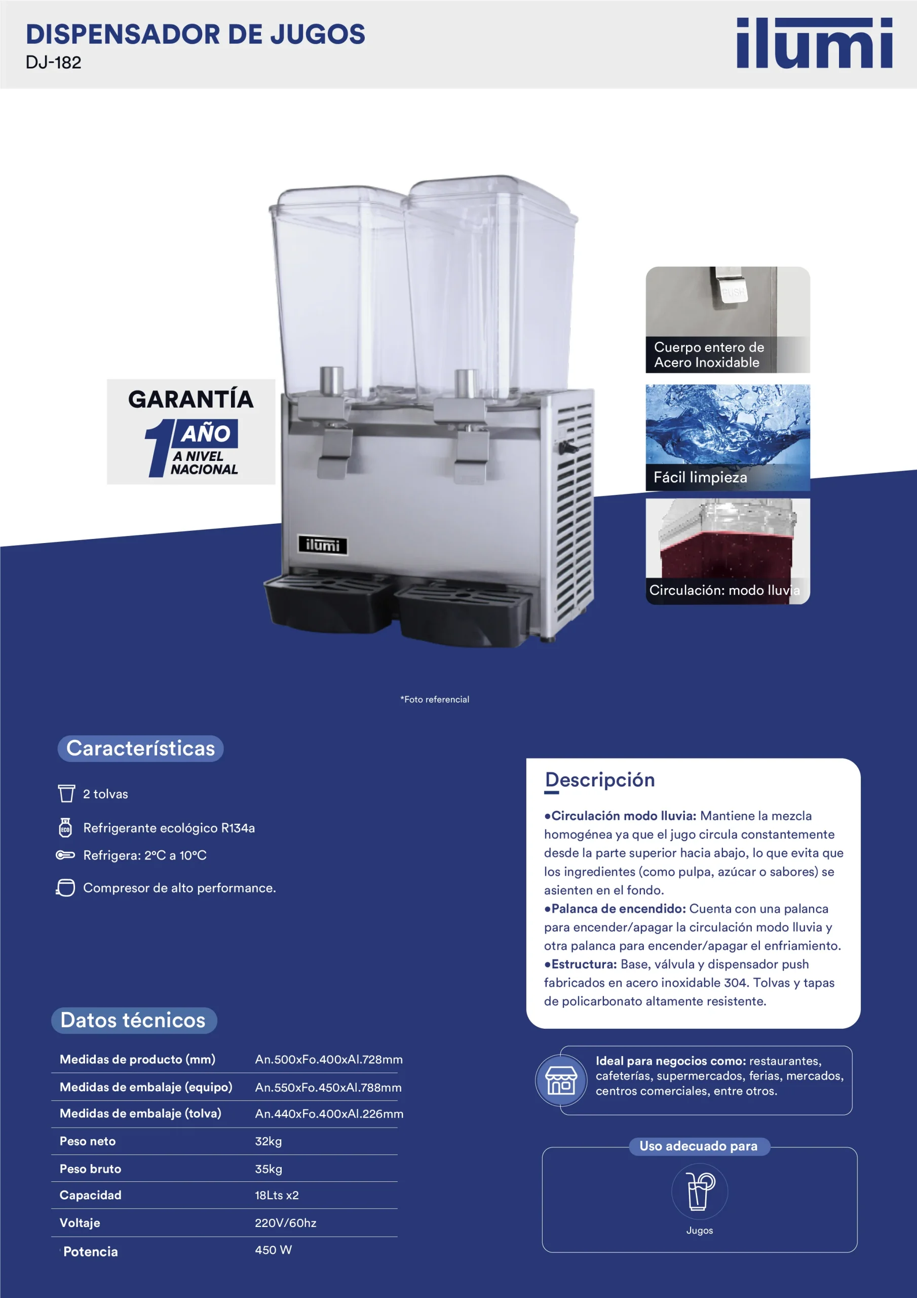 El dispensador de jugos es un equipo esencial para restaurantes, cafeterías, hoteles y negocios de bebidas. Diseñado para mantener jugos, refrescos y otras bebidas frías por más tiempo, facilita el autoservicio y mejora la presentación de tus productos.