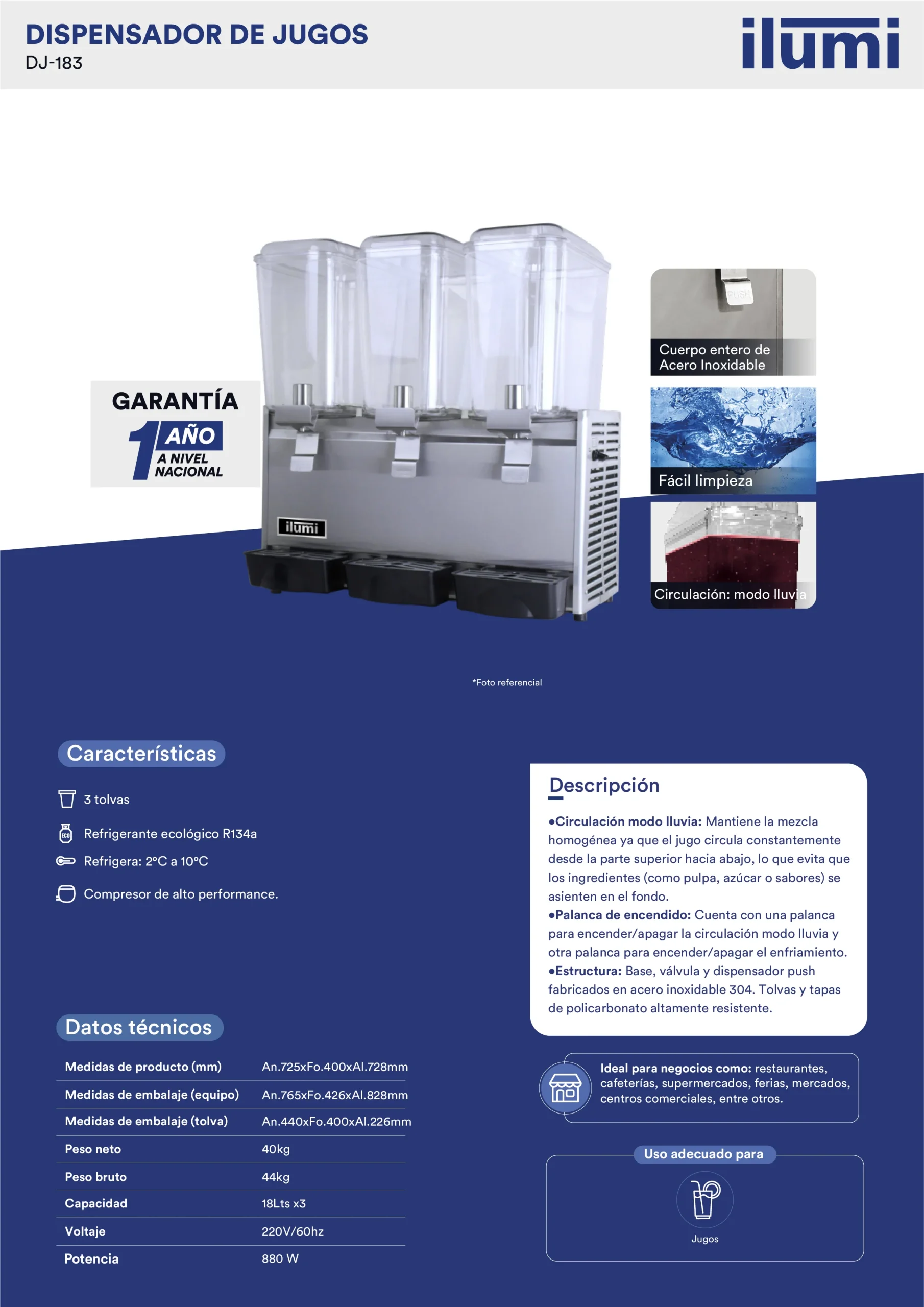 El dispensador de jugos es un equipo esencial para restaurantes, cafeterías, hoteles y negocios de bebidas. Diseñado para mantener jugos, refrescos y otras bebidas frías por más tiempo, facilita el autoservicio y mejora la presentación de tus productos.